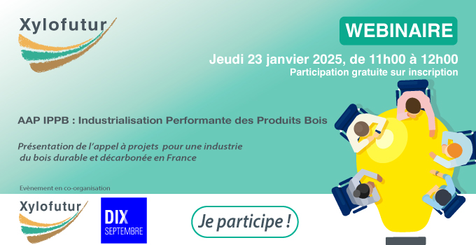 Vous trouverez ci-dessous l’annonce d’un webinaire le jeudi 23 janvier prochain à 11h pour présenter l’appel à projet Industrialisation Performante des Produits Bois (IPPB) porté par l’ADEME.
