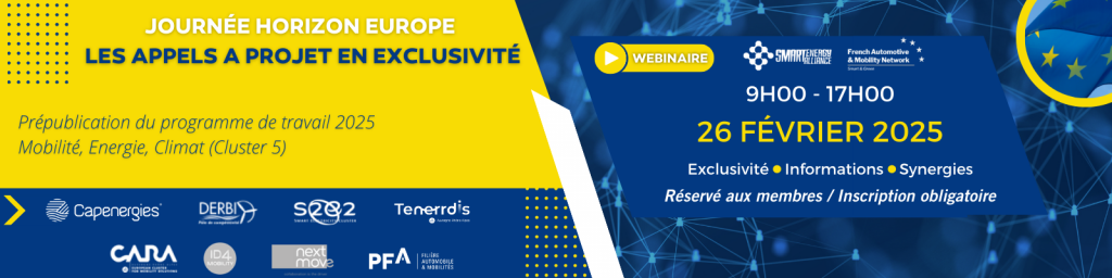 | POURQUOI PARTICIPER A CET EVENEMENT ? Préparez-vous dès maintenant et maximiser vos chances de succès dans les prochains appels à projets du programme phare en matière de recherche et d’innovation HORIZON EUROPE. 77 call présentés I Multithématiques* ► Vous informer en EXCLUSIVITE ► Être accompagné ► Vous connecter à des partenaires clés PROGRAMME 9h : Mot d’accueil Annaïk JUHUETTE-JOUENNE – Directrice Générale, Capenergies 9h05 : Présentation du programme de la journée et explication sur le fonctionnement des salles Elisa SEDAT– Cheffe de projets Europe/International, Capenergies 9h10 : Présentation du programme HORIZON EUROPE 9h30 : Répartition des participants en salles SALLE 1 – (DESTINATION 2, 5 ET 6) • Destination 2 (Batteries) : Solutions intersectorielles pour la transition climatique : Batteries • Destination 5 (Transport) : Solutions propres et compétitives pour tous les modes de transport • Destination 6 (Mobilité) : Services de transport sûrs et résilients et mobilité intelligente passagers marchandises 9h30- 10h10 : Présentation de la destination 2 / Décryptage des calls et Q&A Pauline BONINO – Responsable projets européens, Tenerrdis 10h10 – 11h20 : Présentation de la destination 5 / Décryptage des calls et Q&A Giulia MAIFRINI – Responsable Affaires Européennes & Internationales, NextMove Mathieu SARAIVA – consultant, FAMN 11h20 – 12h : Présentation de la destination 6 / Décryptage des calls et Q&A Véronique ROTTIER – Cheffe de projet Innovation et Europe, ID4Mobility Jean-Baptiste HAHN – Chargé de la cellule europe, CARA SALLE 2 (DESTINATION 3 ET 4) • Destination 3 (Energy supply) : Approvisionnement énergétique durable, sûr et compétitif • Destination 4 (Energy demand) : Utilisation efficace, durable et inclusive de l’énergie 9h30 – 10h : Présentation de la destination 4 / Décryptage des calls et Q&A Lucas FARRE – Chargé de projets Innovation et Europe, Derbi 10h – 12h : Présentation de la destination 3 / Décryptage des calls et Q&A Alexandre CHARI – Chargé de projets européens, S2E2 Elisa SEDAT – Cheffe de projets Europe/International, Capenergies RETOUR SALLE COMMUNE 12h – 12h10 : Présentation accompagnement régions / agences économiques 12h10 – 12h20 : Explication programme après-midi et mot de la fin Elisa SEDAT – Cheffe de projets Europe/International, Capenergies 14h – 17h : Une après-midi dédiée aux synergies ! L’après-midi sera consacrée à des échanges entre potentiels candidats, organisés autour de plusieurs créneaux thématiques. L’objectif est de favoriser la pré-construction de consortiums et de conclure la journée avec des bases concrètes et tangibles pour avancer ensemble. *Thématiques abordées lors de ce webinaire : Bâtiment, Biocarburants, Batteries/Stockage, Sécurité routière, Houlomoteur/ Marémoteur, Photovoltaïque, Énergie thermique, Logistique, Mobilité connectée, Hydroélectricité, Réseau Système énergétiques, Transport maritime, Transport terrestre zéro émission, Thématique Éolien Pour tout renseignement complémentaire, n’hésitez pas à contacter le pôle. Les pôles de compétitivité en lien avec les énergies et la mobilité, le réseau Européen d’Entreprises (EEN) et les points de contact nationaux français sont à votre disposition pour vous informer et vous accompagner sur HORIZON EUROPE, le programme cadre de l’Union Européenne pour le financement de la recherche et de l’innovation. Un évènement organisé par : ![]() |