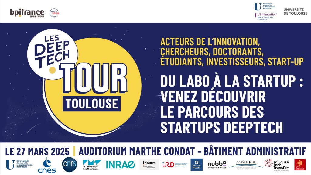 | En tant que chercheurs, doctorants et étudiants, en tant que partenaires de l’écosystème d’innovation ou en tant qu’entreprises partenaires et clientes, vous contribuez tous au succès de notre écosystème Deeptech. Pour sa troisième édition, le Deeptech Tour se réinvente et met à l’honneur les forces vives de la deeptech au sein des pôles académiques, là où commence l’aventure pour faire émerger des technologies de rupture à fort impact. Odile Rauzy, Présidente de l’Université de Toulouse, et Pascale Ribon, Directrice Deeptech Bpifrance ont donc le plaisir de vous inviter au DEEPTECH TOUR TOULOUSE Le 27 mars 2025 de 16h00 à 19h00 Auditorium Marthe Condat – Bâtiment administratif • 118 route de Narbonne, 31400 Toulouse |