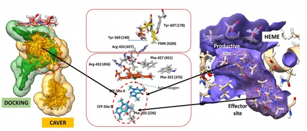 Cytochrome P450 1A2, as many P450 isoenzymes, can generate multiple metabolites from a single substrate. A loose coupling between substrate binding and oxygen activation makes possible substrate reorientations at the active site prior to catalysis. In the present work, caffeine oxidation to alternative bioactive compounds was used to decipher this pluripotency. A model involving two interacting subsites capable of sequentially accommodating one or two caffeine molecules was considered. Molecular dynamics was used to characterize subsite interactions and feed a dedicated geometric encoding of trajectories that was coupled to dimensional reductions and differential machine learning. The two subsites differentially control caffeine orientations and can exchange substrate through a phenylalanine gated mechanism. This exchange can be locked by the presence of a second bound molecule. Complementary roles of subsites in progressively determining the caffeine orientation during its approach to active oxygen were examined. Interestingly, substrate face flipping becomes impaired upon entry into the rather flat active site. This makes the mechanisms that define the orientation of caffeine relative to active oxygen dependent on the substrate face oriented toward heme. Globally, this evidenced that P450 1A2 regioselectivity results from local determinants combined with subsite interactions and caffeine face preselection at a longer distance.