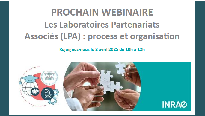 | Face aux grands défis posés à nos sociétés, INRAE se mobilise en faveur de l’innovation et propose, depuis 2021, un dispositif de co-développement et co-innovation : le laboratoire partenarial associé (LPA). Ce dispositif permet à INRAE et ses partenaires de mettre en commun leurs moyens matériels et humains autour de programmes de recherche et ainsi accélérer la mise au point d’innovations. Le LPA est également l’un des premiers processus d’appui modélisé à INRAE, dans le cadre d’une démarche qualité au service du développement du partenariat de l’institut et d’un pilotage efficace et stratégique de ses projets. Ainsi, le processus « Création d’un Laboratoire Partenarial Associé » décrit en 6 étapes les différentes phases d’instruction et validation du montage d’un LPA, et impliquant, en plus des collectifs de recherche, de nombreux acteurs : IPP, CCI, CPI, DSA, PC, CD, SCIC et DPTI. Au cours de ce webinaire, nous proposons de revenir sur ce qu’est un LPA et de présenter les évolutions qui ont été apportées courant 2024 au processus et au modèle de contrat suite aux premiers retours. Nous détaillerons également les rôles et implications des différents acteurs dans le montage d’un LPA. Un temps sera également consacré aux questions pour répondre à vos questions sur l’instruction de la création des LPA. Au programme de ce webinaire de 2 heures : Introduction (Valérie Archambault, Directrice de la DPTI) Présentation des LPA (Anne Brunner) La qualité : méthodologie et amélioration continue (Mélaine Alizond) Process et recommandations pour le montage des LPA (Céline Delmas, Mélanie Roméro, Anne Brunner) Temps d’échange en direct Au plaisir de vous retrouver le 8 Avril ! |