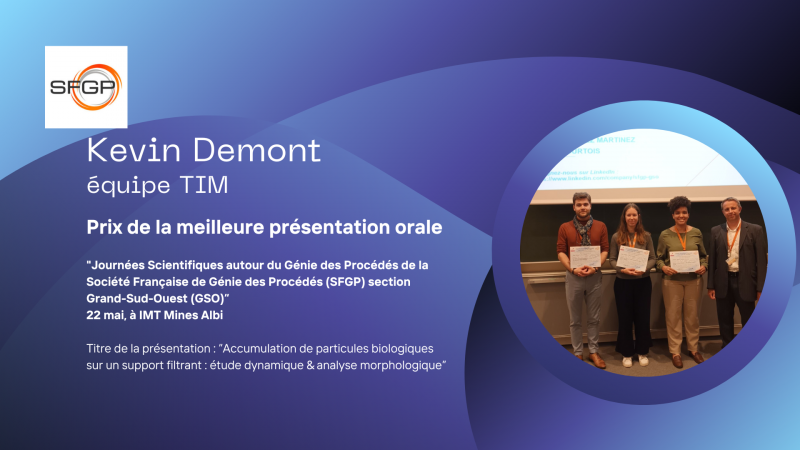 Félicitations à Kevin Demont, équipe TIM, qui a obtenu le prix de la meilleure présentation orale lors des Journées Scientifiques autour du Génie des Procédés de la Société Française de Génie des Procédés (SFGP) section Grand-Sud-Ouest (GSO)” le 22 mai, à IMT Mines Albi.