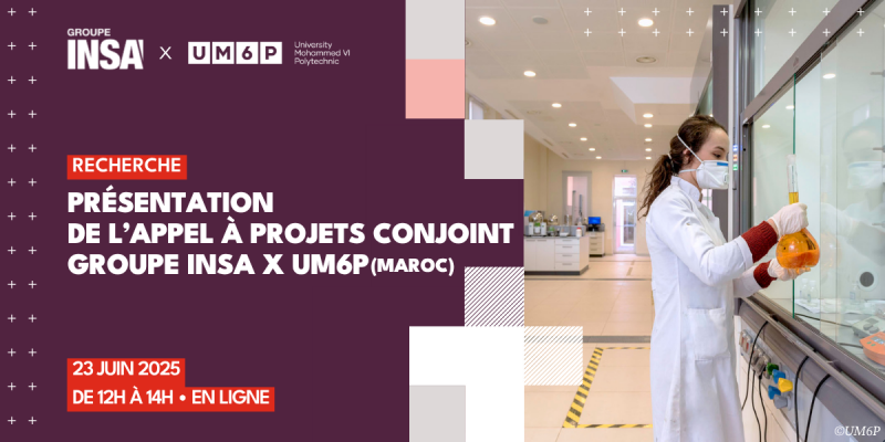 | 23 juin 2025 Chères et chers collègues, Le Groupe INSA et l’Université Mohamed VI Polytechnique (UM6P), au Maroc, ont signé en 2024 un accord de coopération scientifique, affirmant une volonté d’associer leurs potentiels académiques pour répondre aux enjeux du 21e siècle et aux défis du continent africain par la science et l’innovation. L’UM6P a placé l’innovation et la recherche au cœur de sa stratégie de développement et ne cesse de renforcer sa coopération avec le monde académique et les institutions publiques tant au Maroc qu’au niveau international, pour développer l’enseignement supérieur et la recherche. Le Groupe INSA, dont le potentiel scientifique est structuré en cinq enjeux sociétaux, s’engage pour une recherche à impact – de la recherche fondamentale aux transferts technologiques – au service de développements et d’innovations soutenables. Les deux institutions ont souhaité concentrer, dans un premier temps, leurs collaborations sur la recherche. Elles proposent ainsi à leur communauté recherche un appel à projets conjoint, qui cible quatre thématiques scientifiques :• Eau (Water)• Énergies renouvelables (Renewable Energies) • Fabrication intelligence (Smart Manufacturing)• Chimie des procédés (Process Chemistry) |