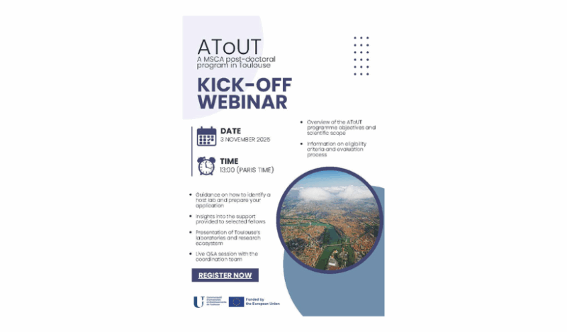 Nous avons le plaisir de vous informer que le programme postdoctoral AToUT (MSCA) tiendra son webinaire de lancement le lundi 3 novembre à 13h (heure de Paris), à l’occasion de l’ouverture de l’appel à candidatures.