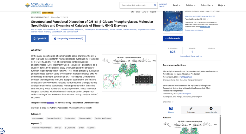 N2 – In the CAZy classification of carbohydrate-active enzymes, the GH-Q clan regroups three distantly related glycoside hydrolase (GH) families: GH94, GH149, and GH161. These families contain glycoside phosphorylases (GPs) that mainly use α–d-glucose-1-phosphate as a glucosyl donor. In the present study, we investigated the structure–function relationships within family GH161, which exhibits β-1,3-glucan phosphorylase activity. Using cryo-electron microscopy (cryo-EM), we determined the dimeric structure of a GH161 enzyme. Comparison between the unliganded form, the acceptor-bound form, and finally a catalytically active complex revealed conformational changes during catalysis that involve coordinated rearrangements within the active site, including loops held by the adjacent protomer. These structural insights, combined with biochemical characterization, deepen our understanding of the molecular determinants driving catalysis in GH-Q enzymes.