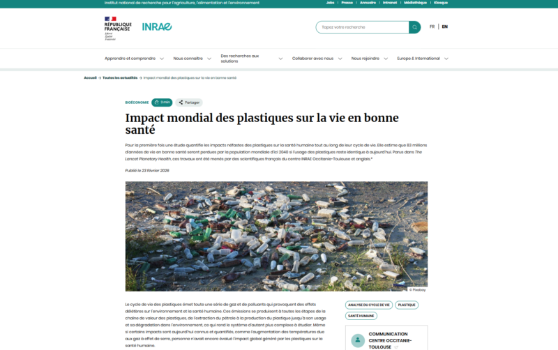 Pour la première fois une étude quantifie les impacts néfastes des plastiques sur la santé humaine tout au long de leur cycle de vie. Elle estime que 83 millions d’années de vie en bonne santé seront perdues par la population mondiale d’ici 2040 si l’usage des plastiques reste identique à aujourd’hui. Parus dans The Lancet Planetary Health, ces travaux ont été menés par des scientifiques français du centre INRAE Occitanie-Toulouse et anglais.