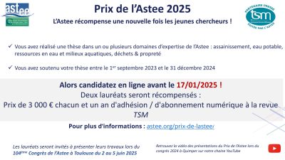 L’Astee récompense chaque année des docteurs ayant soutenus leur thèse dans l’année sur un des domaines de l’Astee (assainissement, eau,…