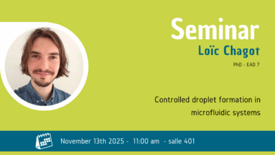 Jeudi, 13 novembre⋅– 11:00 salle 401 TBI seminar / L. Chagot EAD7 Controlled droplet formation in microfluidic systems Abstract: Microfluidic…