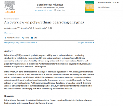 Agata Raczyńska, Artur Góra, Isabelle André,An overview on polyurethane degrading enzymes,Biotechnology Advances,2024,108439,ISSN 0734-9750,https://doi.org/10.1016/j.biotechadv.2024.108439.(https://www.sciencedirect.com/science/article/pii/S0734975024001332)Abstract: Polyurethanes (PUR) are durable synthetic polymers widely…